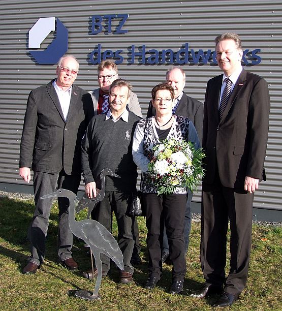 Neben Haake und seiner Ehefrau Silvia hatten sich die Arbeitskollegen sowie BTZ-Geschäftsführer Tilman Stürmer, Hans-Dieter Gausmann, Geschäftsführer bei der Handwerkskammer (HWK) Osnabrück-Emsland-Grafschaft Bentheim und Edgar Ennen, Obermeister der Malerinnung, eingefunden, um den baldigen Ruheständler zu ehren.