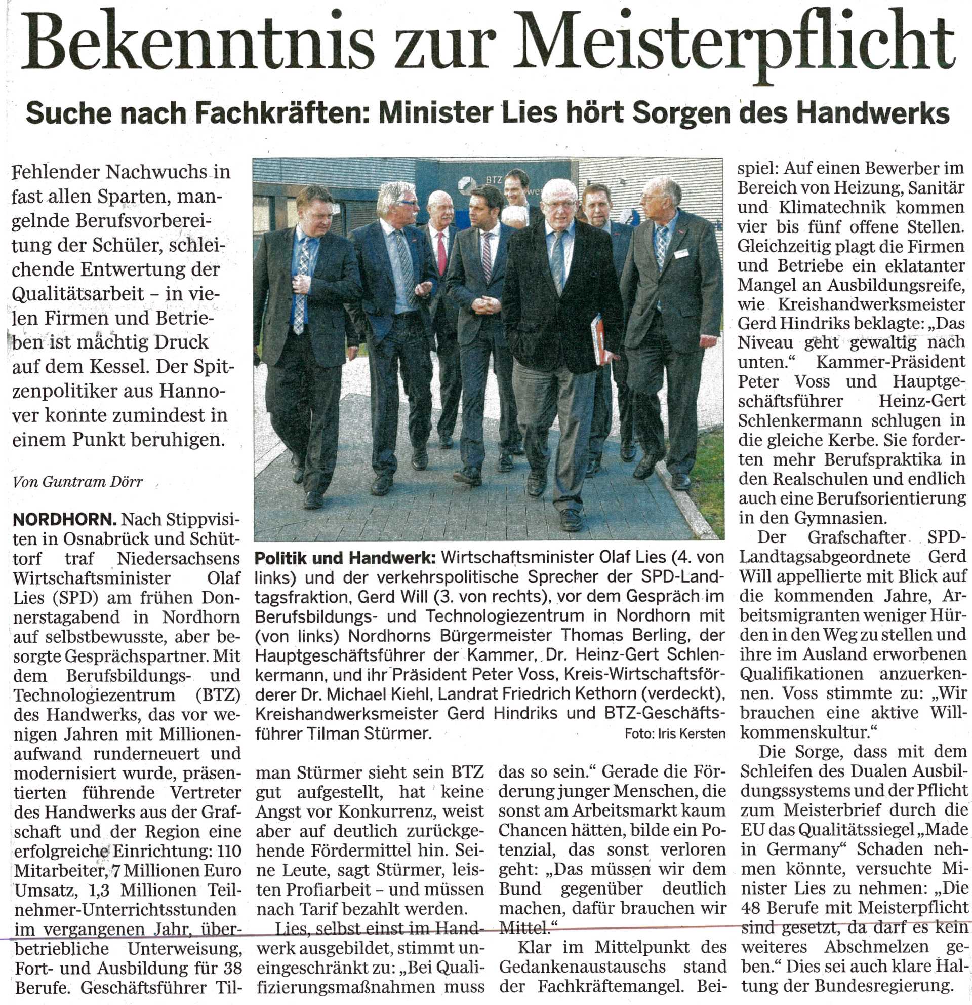 Den BTZ-Standort Nordhorn besuchte der Niedersächsische Wirtschaftsminister Olaf Lies während einer Rundreise durch das westliche Niedersachsen. Hier traf er nicht nur auf die BTZ-Geschäftsführung, sondern auch auf Vertreter der Handwerkskammer und der Kreishandwerkerschaft. Ebenfalls dabei waren unter anderem Landrat Friedrich Kethorn, Bürgermeister Thomas Berling und der Landtagsabgeordnete Gerd Will. Lesen Sie dazu den Bericht der Grafschafter Nachrichten.