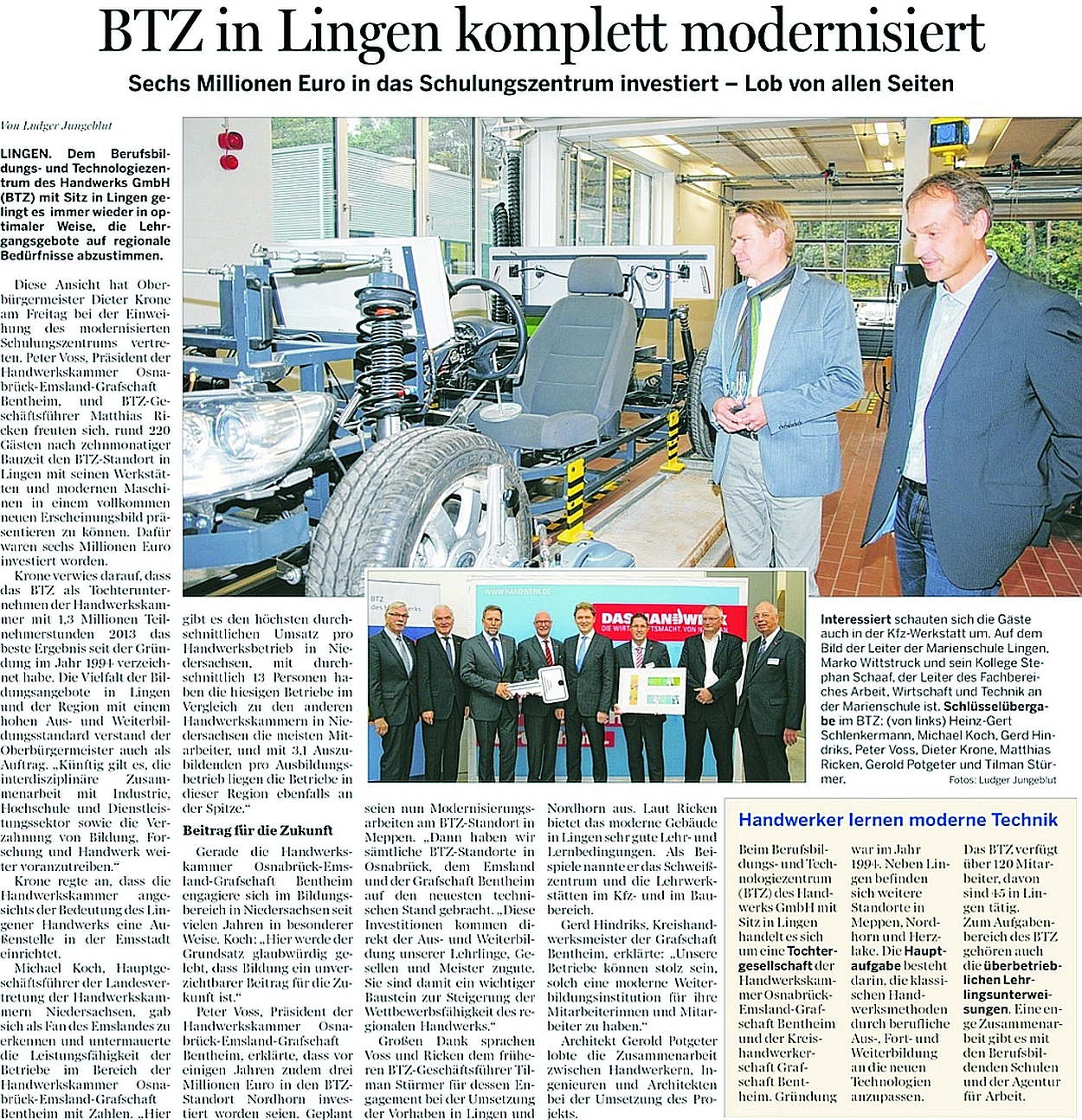 Mehr als 200 Gäste waren zur Einweihungsfeier ins BTZ nach Lingen geladen. Nach Reden von Handwerkskammerpräsident Peter Voss, Kreishandwerksmeister Gerd Hindriks, Lingens Oberbürgermeister Dieter Krone und Michael Koch, Geschäftsführer der Landesvertretung der HWK's in Niedersachsen, bedankte sich BTZ-Geschäftsführer Matthias Ricken nicht nur bei den Handwerkern, Geldgebern und allen weiteren Verantwortlichen, sondern auch bei seinen Mitarbeitern und nahm gemeinsam mit Voss von Architekt Gerold Potgeter den Schlüssel für das neue Gebäude entgegen. Zu den Medienberichten geht es rechts.