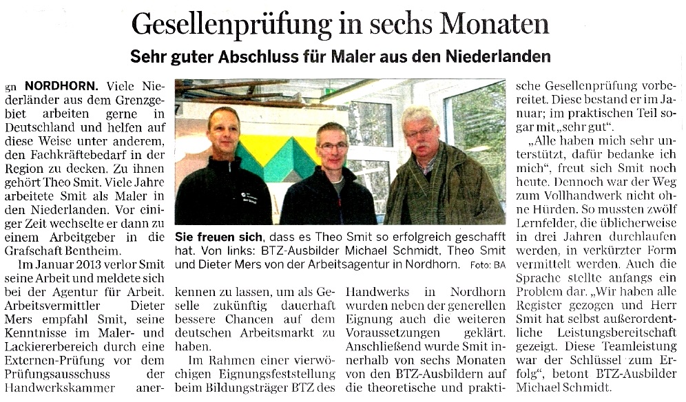 Im Auftrag der Agentur für Arbeit unterstützte das BTZ in Nordhorn einen Maler aus den Niederlanden, der bereits seit Längerem in Deutschland arbeitete, bei der Vorbereitung auf die Externen-Gesellenprüfung vor dem Gesellenprüfungsausschuss der Handwerkskammer. Und das alles in nur sechs Monaten!