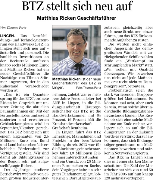 Der seit April im Amt befindliche Geschäftsführer Matthias Ricken gab nach gut 100 Tagen als Verantwortlicher beim größten gewerblich-technischen Bildungsanbieter der Region der Lingener Tagespost ein erstes Pressegespräch. Der studierte Betriebswirt sieht das BTZ mit einem guten Fundament versehen. Er plant neue Strukturen einführen, "um das BTZ für die kommenden Aufgaben zu rüsten."